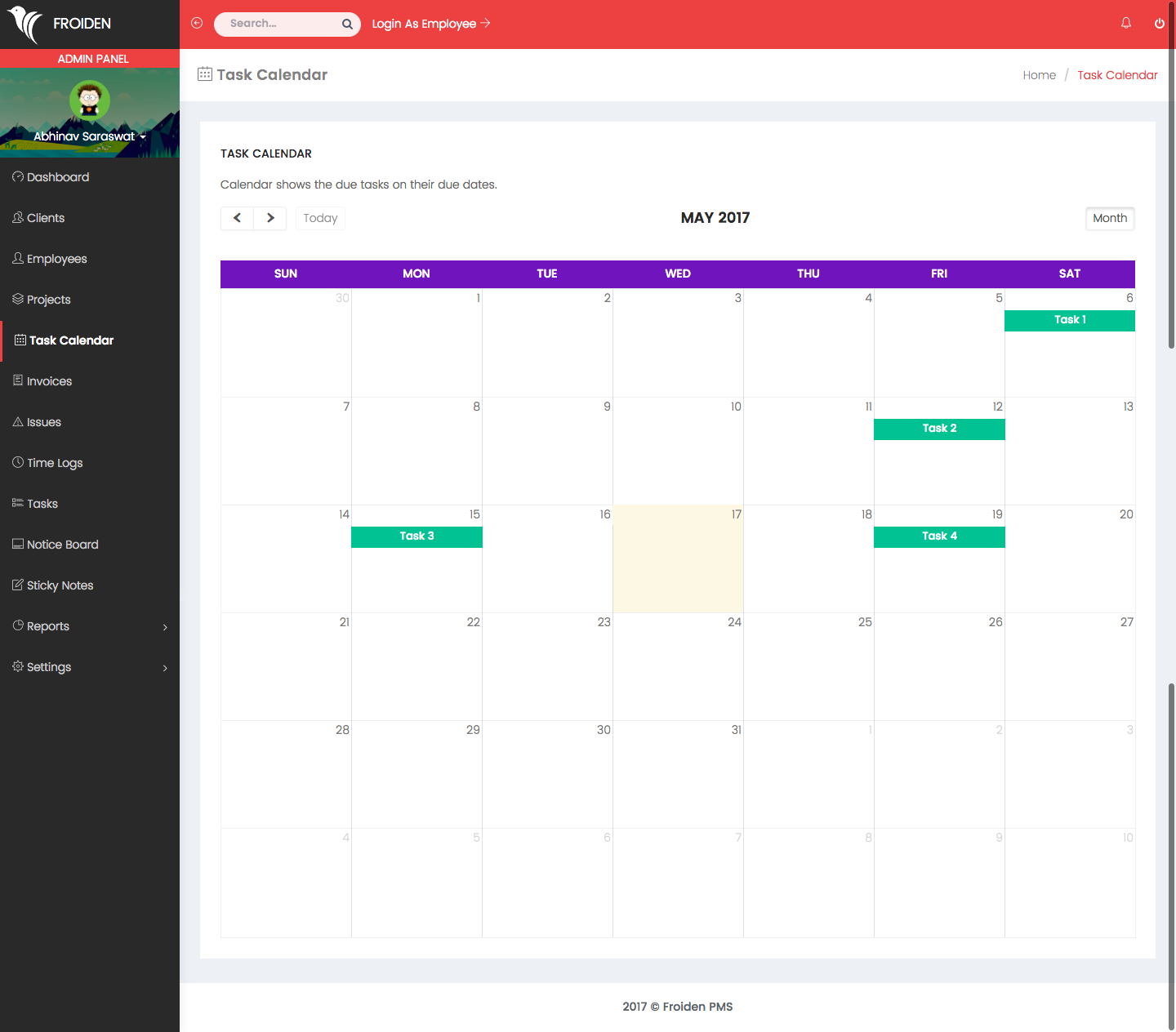 It shows all the tasks which an employee has been assigned on a calendar according to their due dates.