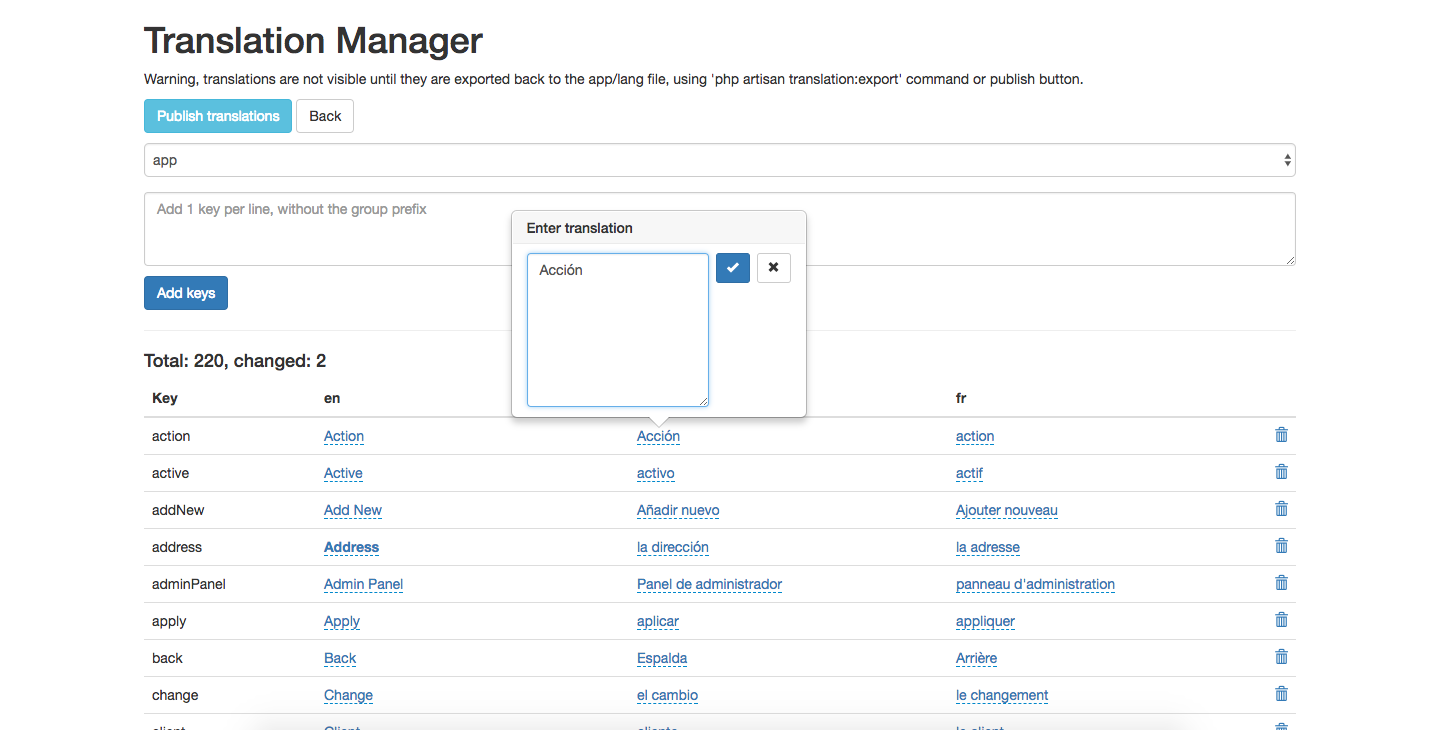Now just click on the Publish translations button on top to apply the changes.