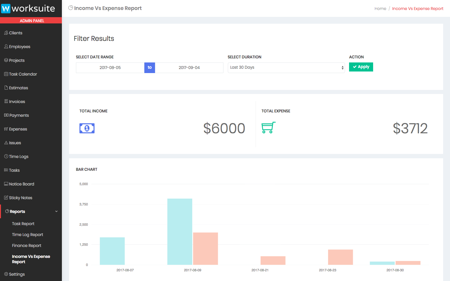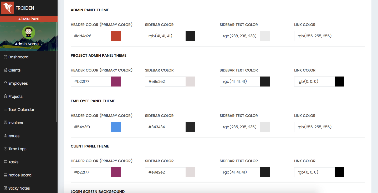 Admin dashboard shows important information about your projects, payments, clients and employees.